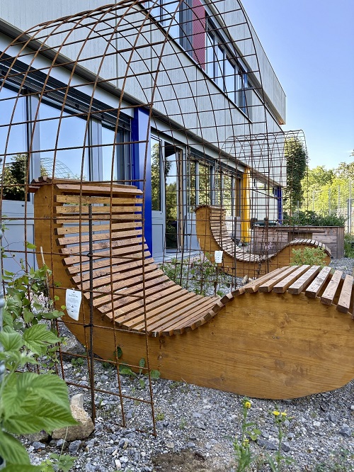 Dafür wurden robuste Baustahlmatten über den Liegen gespannt und fest verankert. An den Enden wurden Clematis-Pflanzen gesetzt, die in den kommenden Monaten an den Matten emporranken und für natürlichen Sonnenschutz sorgen werden.